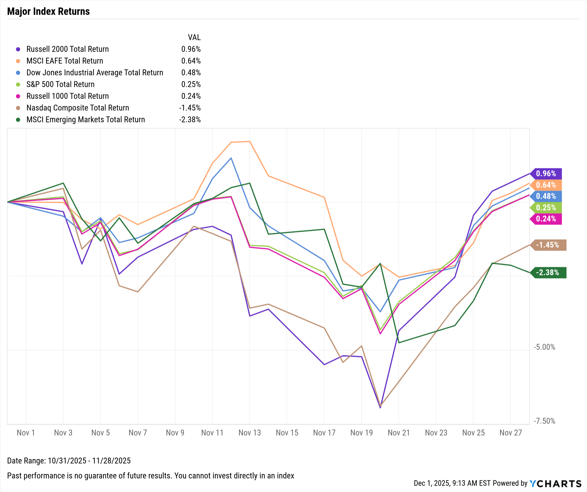 Markets were relatively flat in November despite heightened volatility as the S&P 500 posted a gain of 0.3%. Emerging markets took the biggest hit, ending the month down 2.4%, followed by the Nasdaq, which declined 1.5%.
