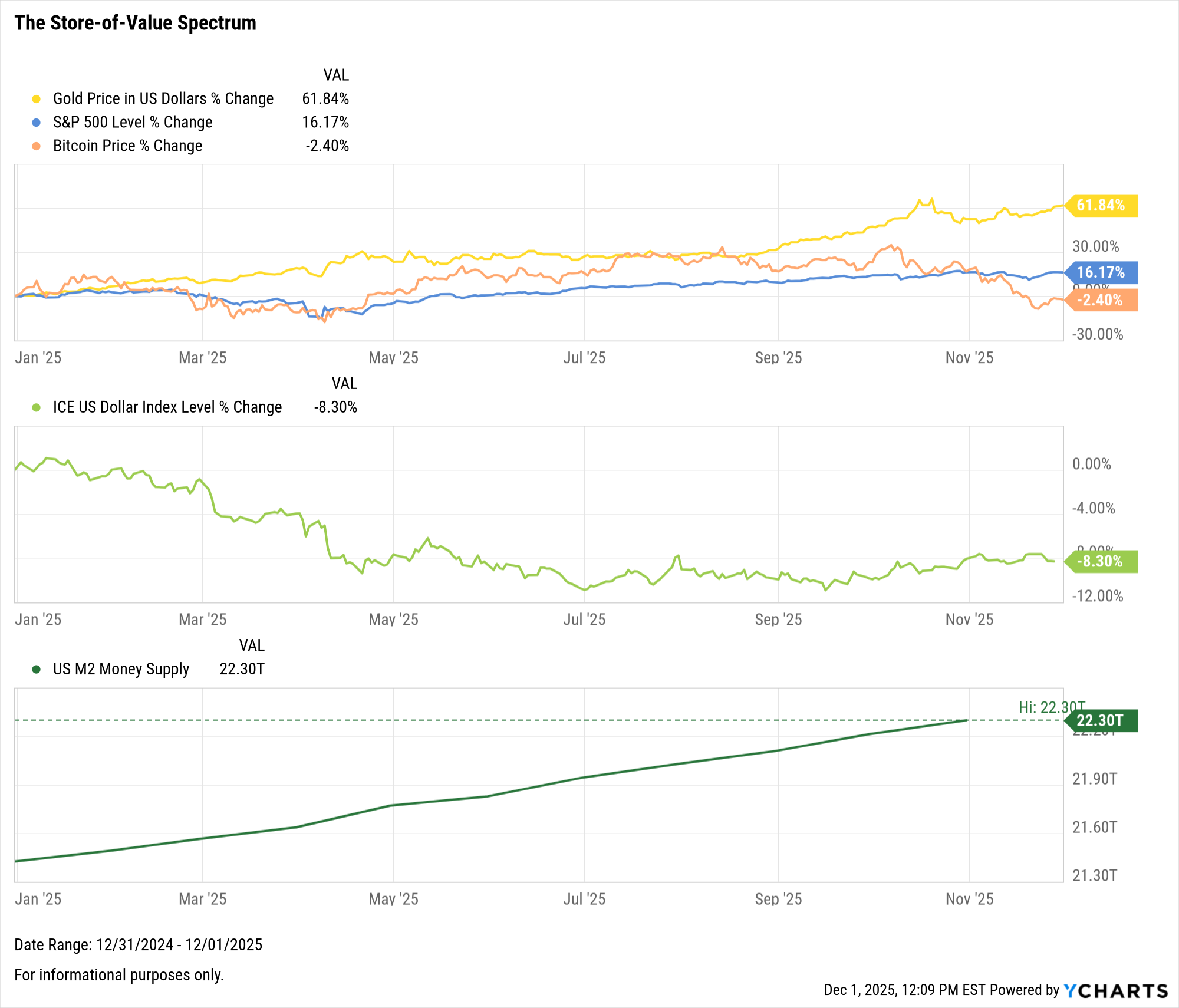 Gold has been the absolute standout. Up more than 60% year to date, it has responded consistently to rising money supply, persistent fiscal concerns, and a dollar that has fallen more than 8%. This combination has helped fuel steady demand for the most traditional form of value preservation, which gold has more than reflected throughout the year.