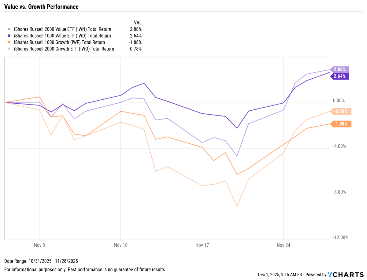 This year has been defined by significant market-moving headlines and economic conditions, which have tested the strength of investor sentiment. Tariffs, rate cuts, AI acceleration, and the longest government shutdown in history, to name a few, have left various asset styles sitting at surprising levels with one month remaining in the year.