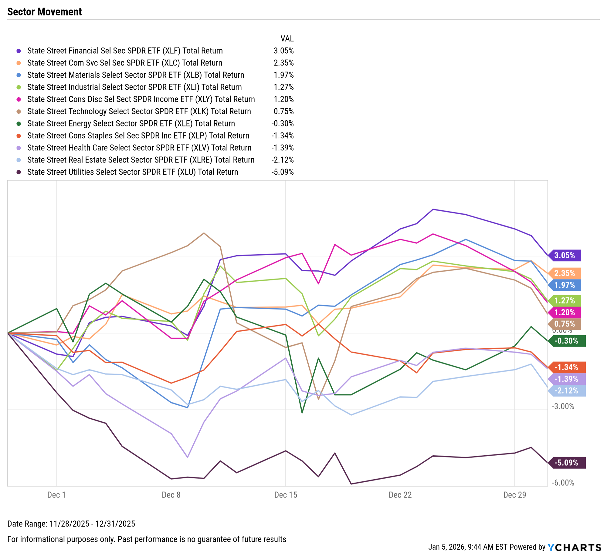 Sector performance was also split for the month, as Financials led, advancing 3.1%. Communication Services, Materials, and Technology were all positive in December. Utilities took the most significant hit, ending down 5.1%, followed by Real Estate, which was down 2.1%.
