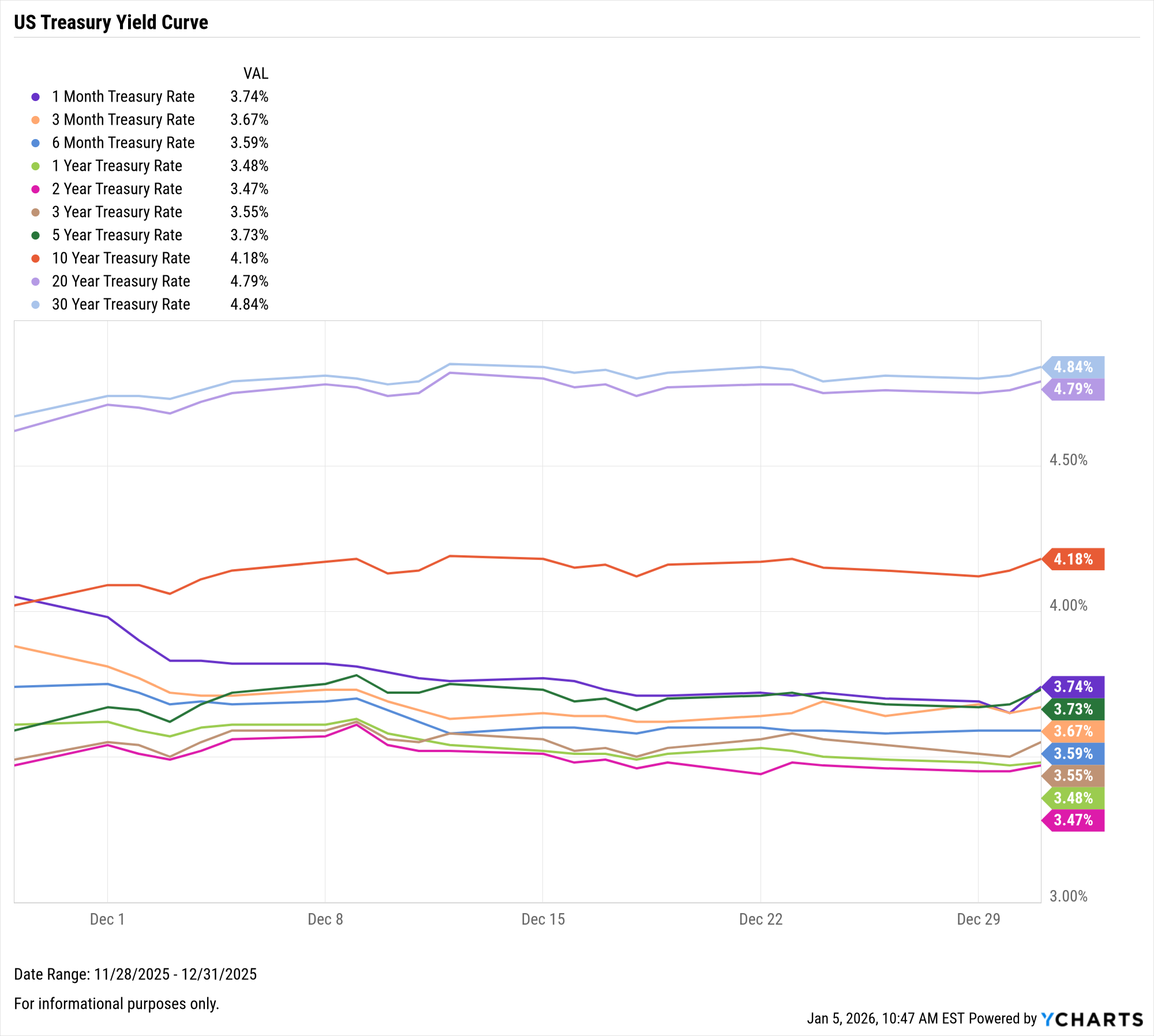 Welcome back to YCharts’ Monthly Market Wrap, your data-driven recap of market trends shaping portfolios and client conversations. In December, markets finished 2025 with diverging performance as investors repositioned portfolios and set expectations for 2026. Delayed economic data began to resume, restoring visibility into labor and inflation trends. Treasury yields showed renewed movement across the curve, while cryptocurrencies remained under pressure. Policy, growth, and inflation dynamics now take center stage as markets enter 2026.