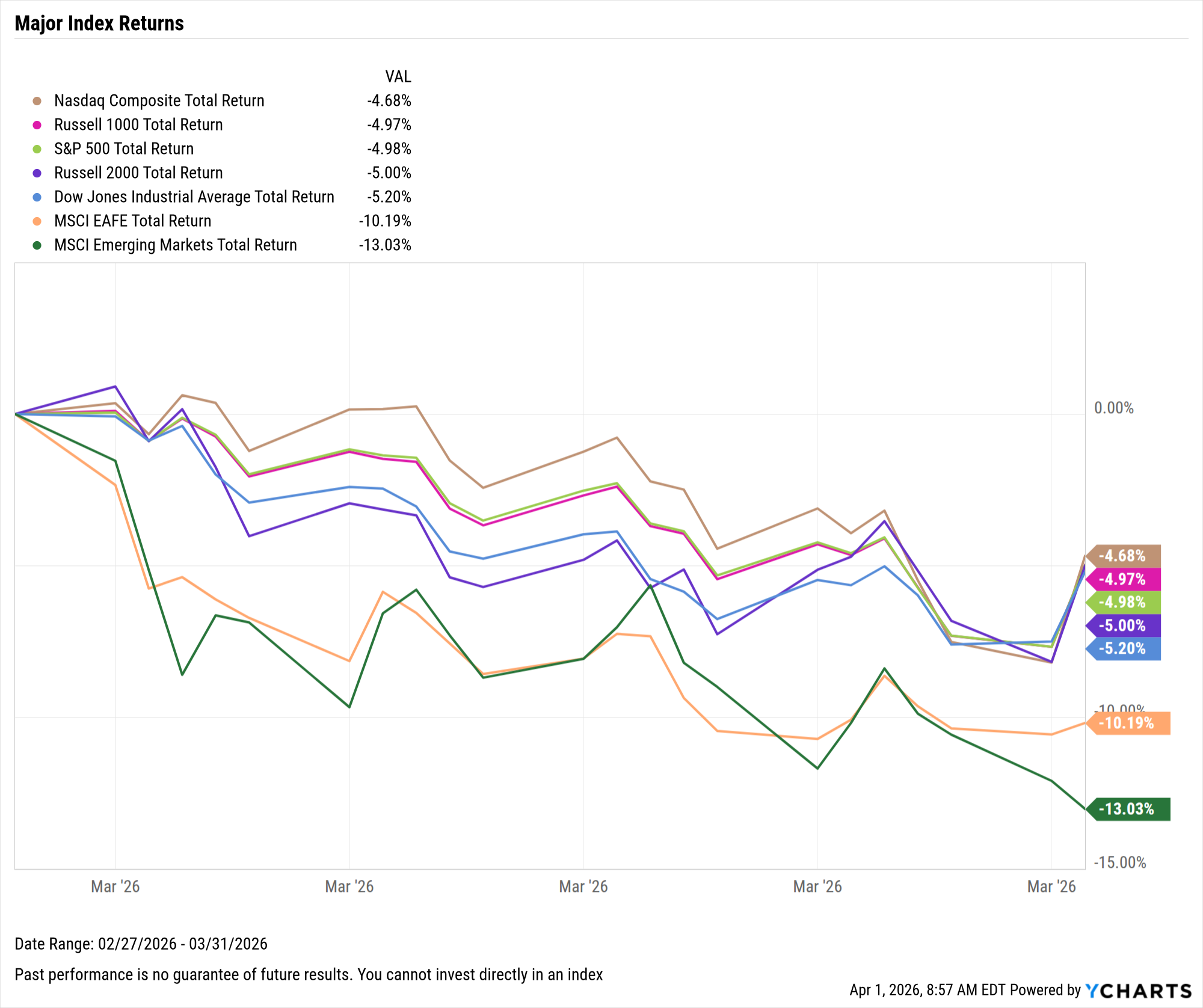 Welcome back to YCharts’ Monthly Market Wrap, your data-driven recap of market trends shaping portfolios and client conversations. In March, all major indices, both domestic and international, were sent lower following the U.S. strikes on Iran. The S&P 500 posted its worst month since September 2022, losing 4.98%. Oil prices and the energy sector were sent sharply higher due to concerns over energy constraints, precious metals retreated, while cryptocurrencies broke their five-month losing streak.
