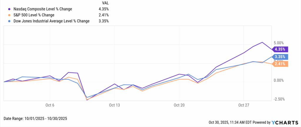 This latest shutdown, which began on October 1, has now stretched to 30 days, with no resolution in sight. Like most past shutdowns, markets have shown a limited immediate reaction, instead focusing on earnings fundamentals and ongoing developments in Federal Reserve policy.