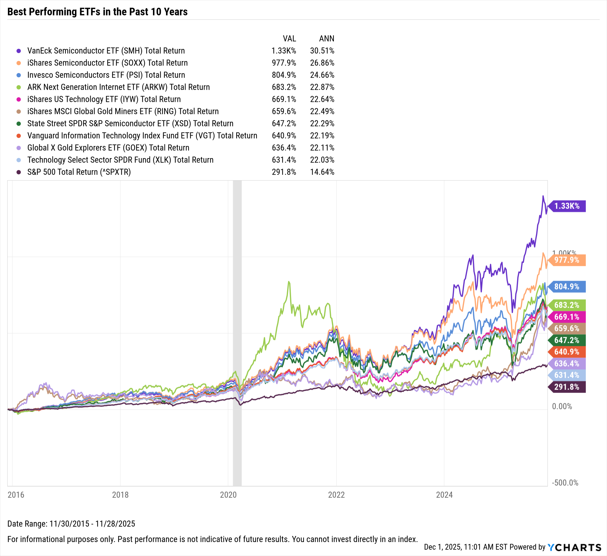 These are the top-performing ETFs on an annualized basis between December 1, 2015 and November 30, 2025.