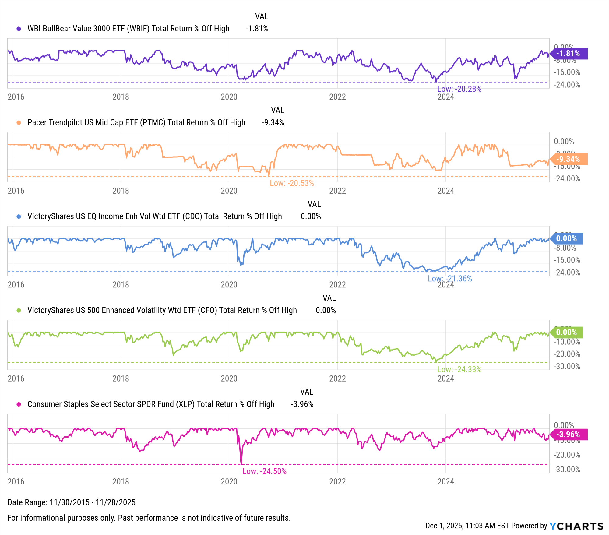 As of November 30, 2025, these equity ETFs had the lowest drawdown over the last ten years. The chart below can be expanded to comprehensively depict the peak-to-trough performance of the observed funds.