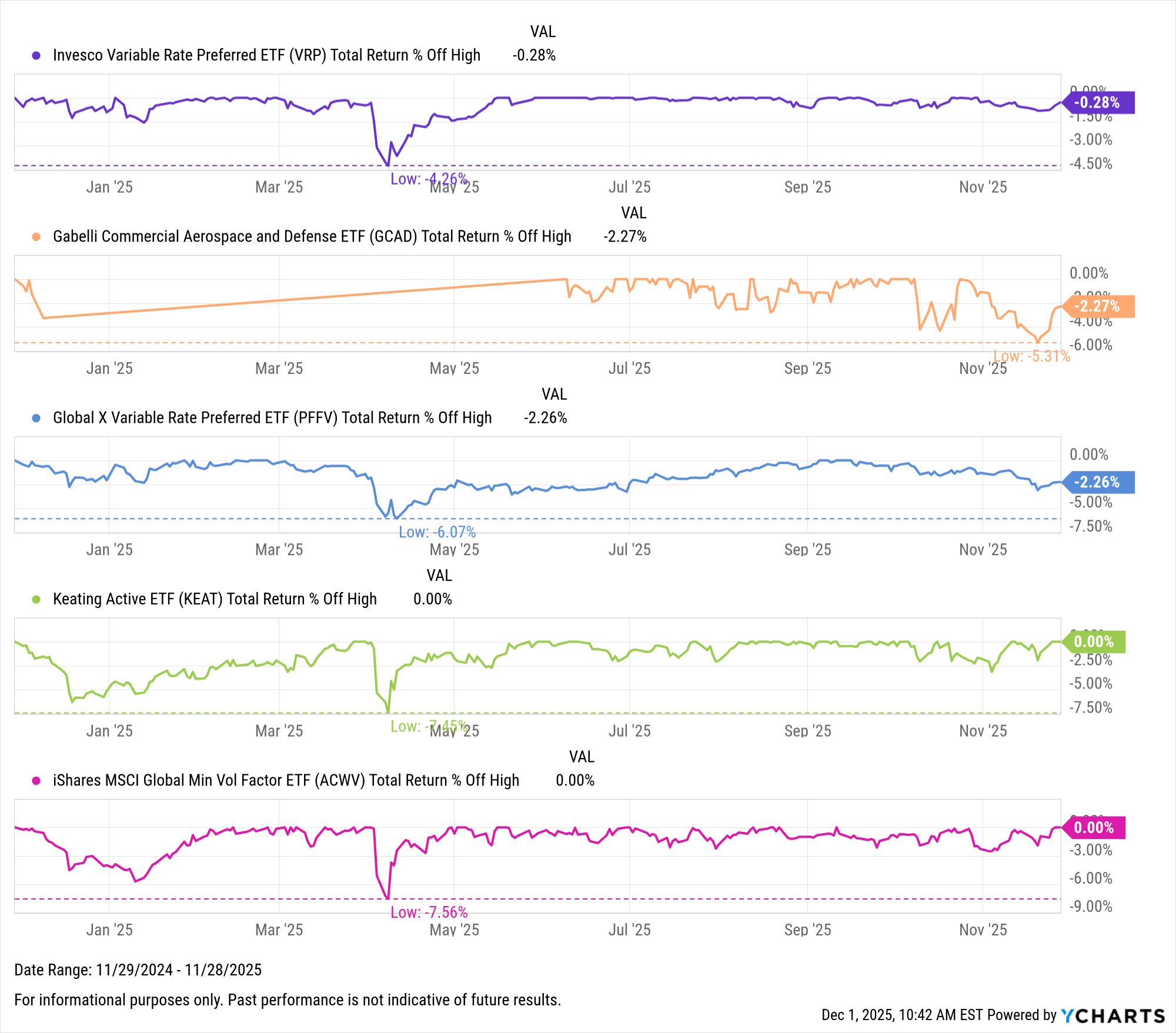 As of November 30, 2025, these equity ETFs had the lowest drawdown over the last year. The chart below can be expanded to comprehensively depict the peak-to-trough performance of the observed funds.