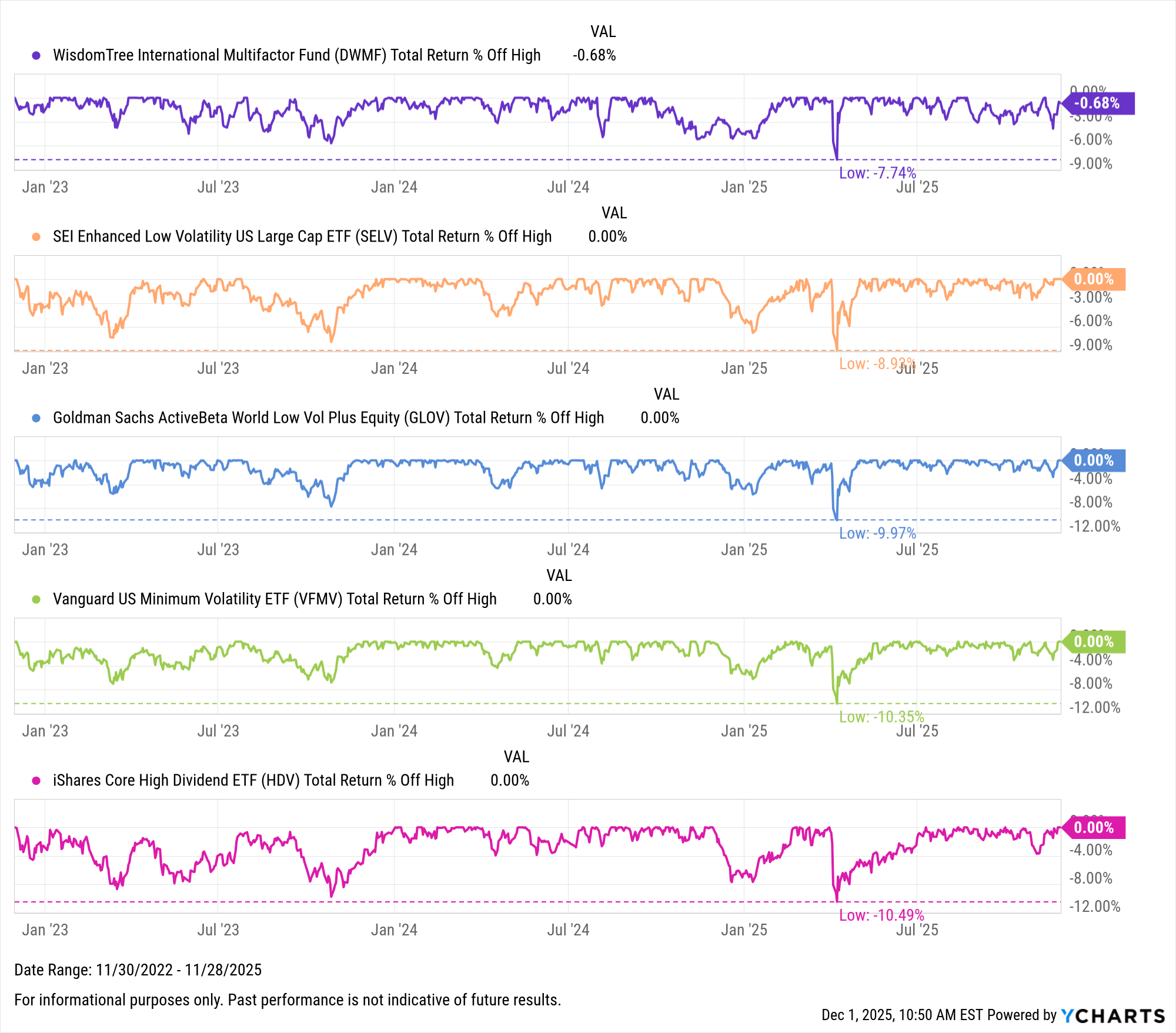 As of November 30, 2025, these equity ETFs had the lowest drawdown over the last three years. The chart below can be expanded to comprehensively depict the peak-to-trough performance of the observed funds.