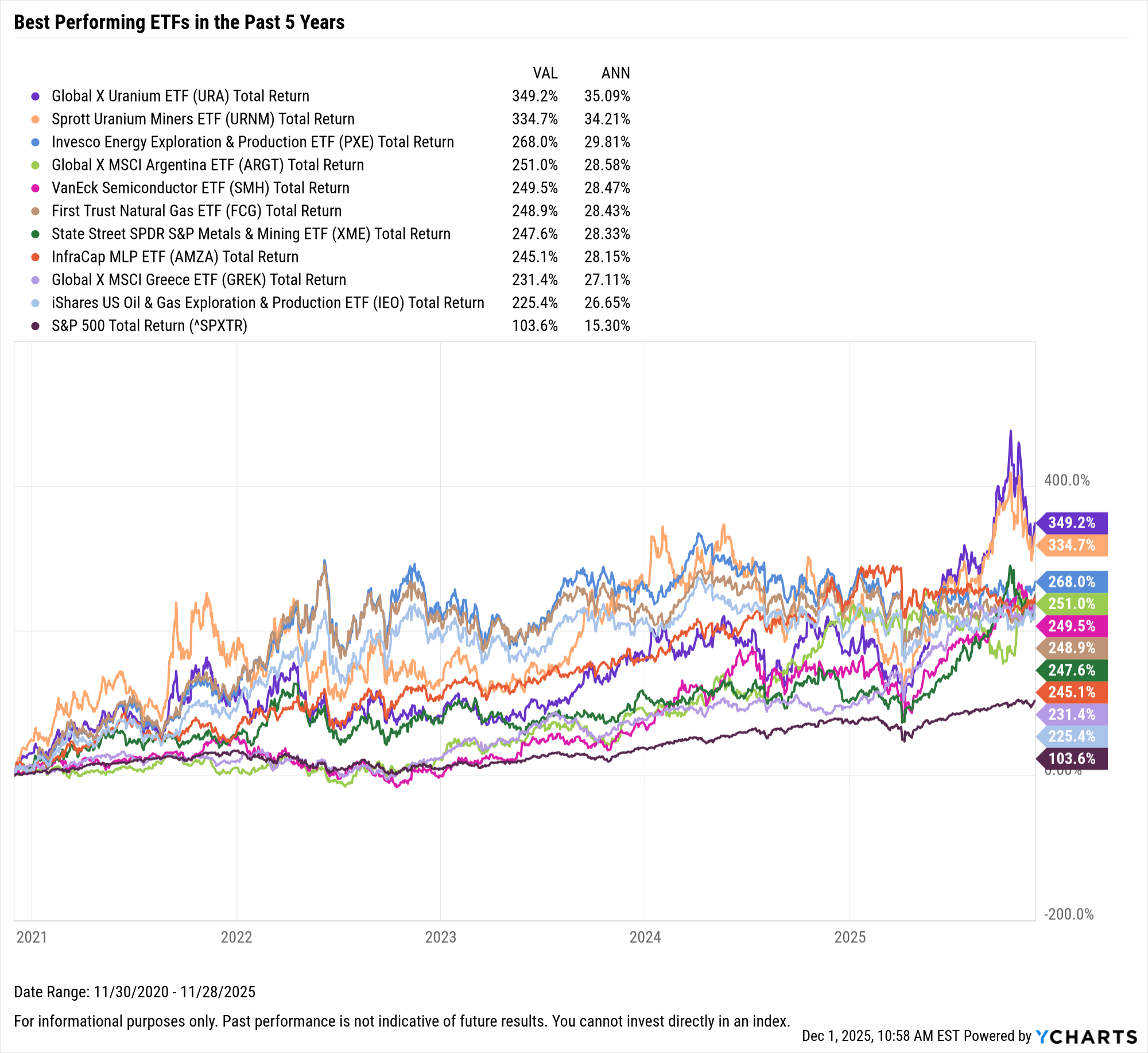 These are the top-performing ETFs on an annualized basis between December 1, 2020 and November 30, 2025.