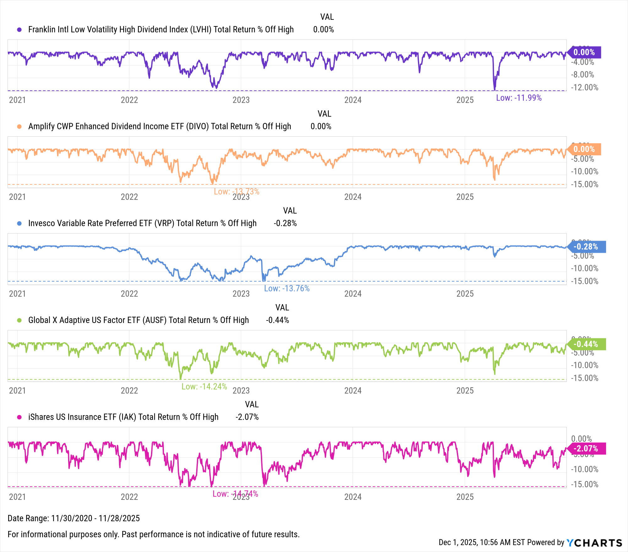 As of November 30, 2025, these equity ETFs had the lowest drawdown over the last five years. The chart below can be expanded to comprehensively depict the peak-to-trough performance of the observed funds.