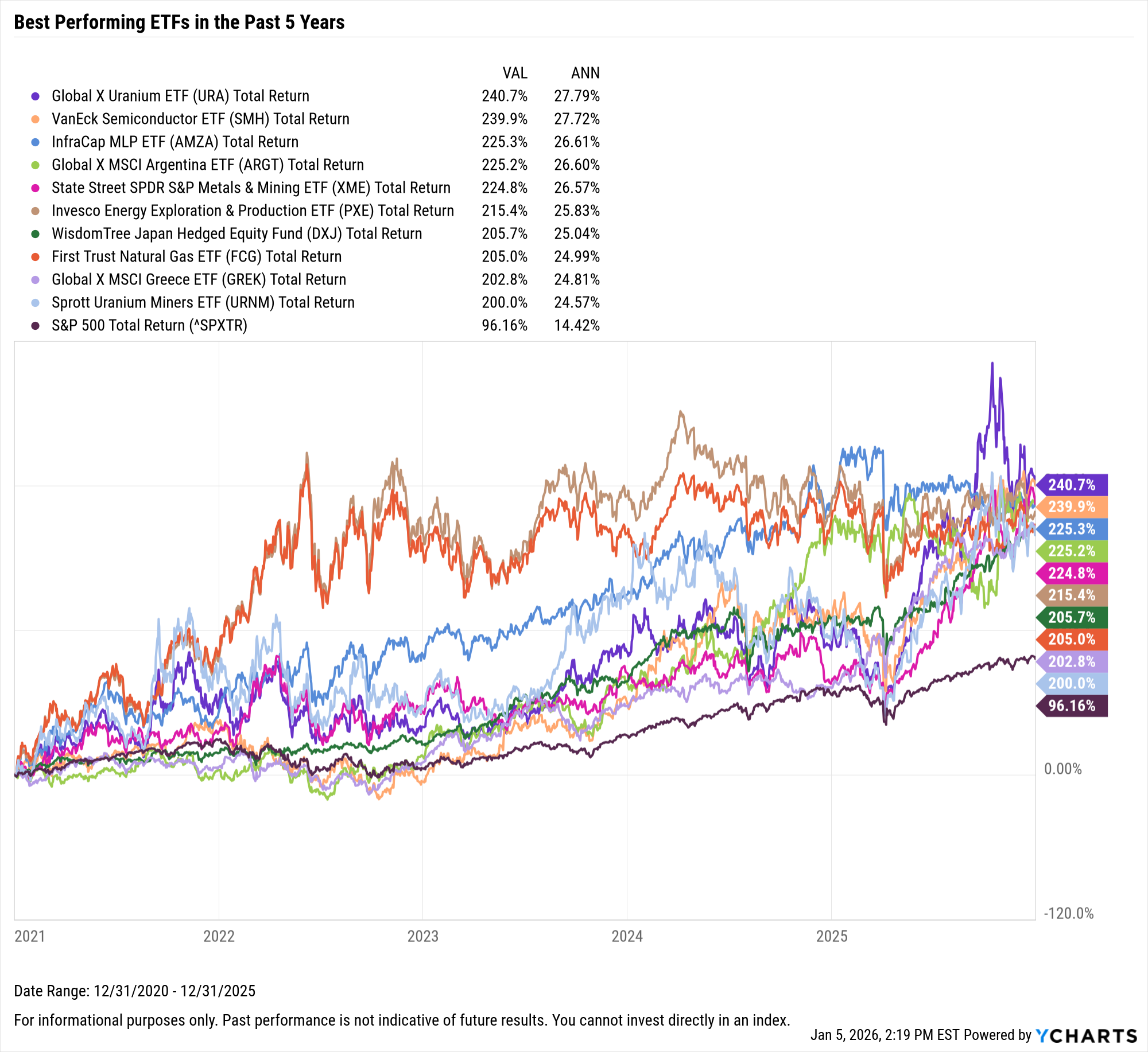 These are the top-performing ETFs on an annualized basis between January 1, 2021 and December 31, 2025.