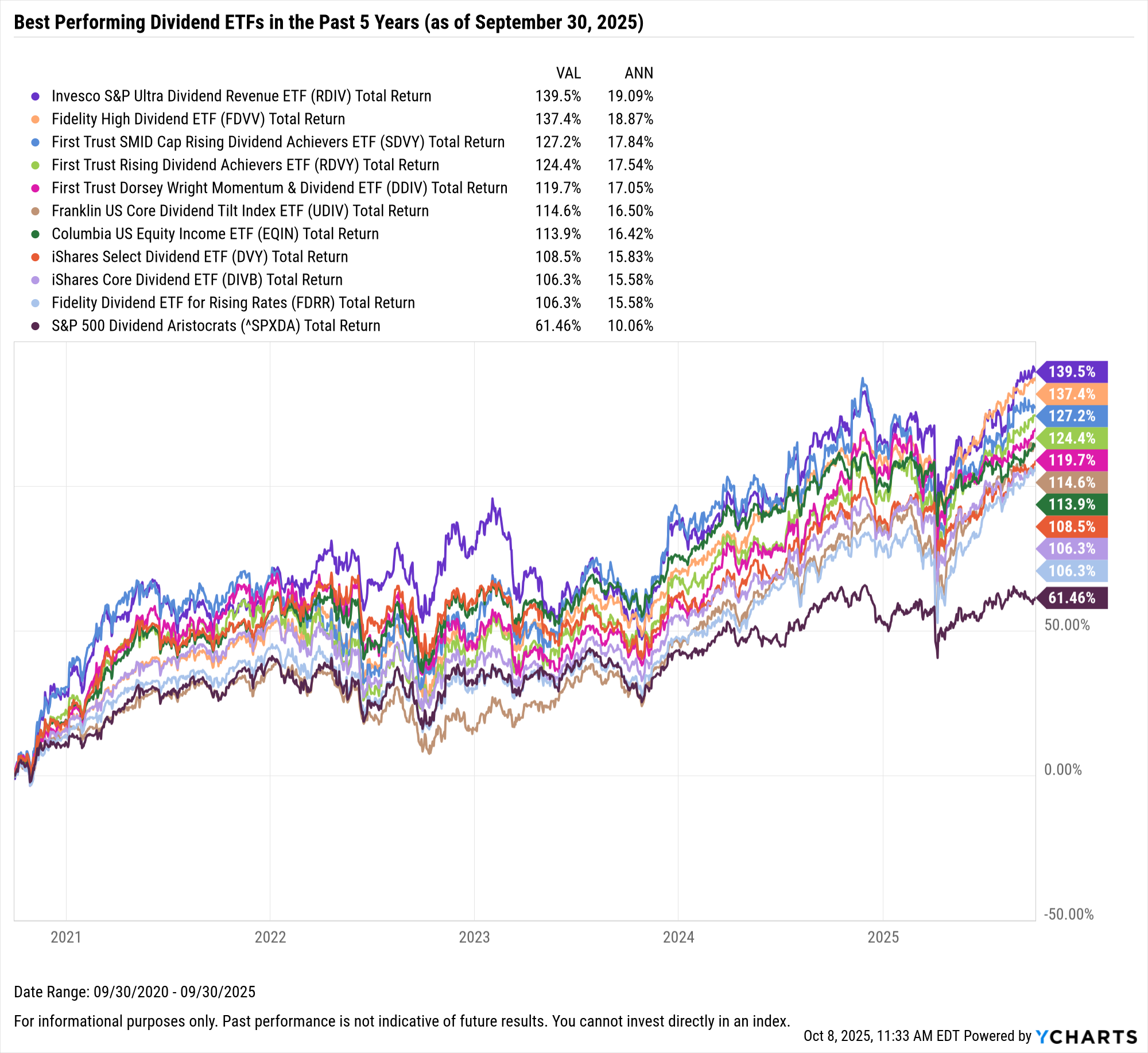 These are the top-performing dividend ETFs on an annualized basis between October 1, 2020 and September 30, 2025.