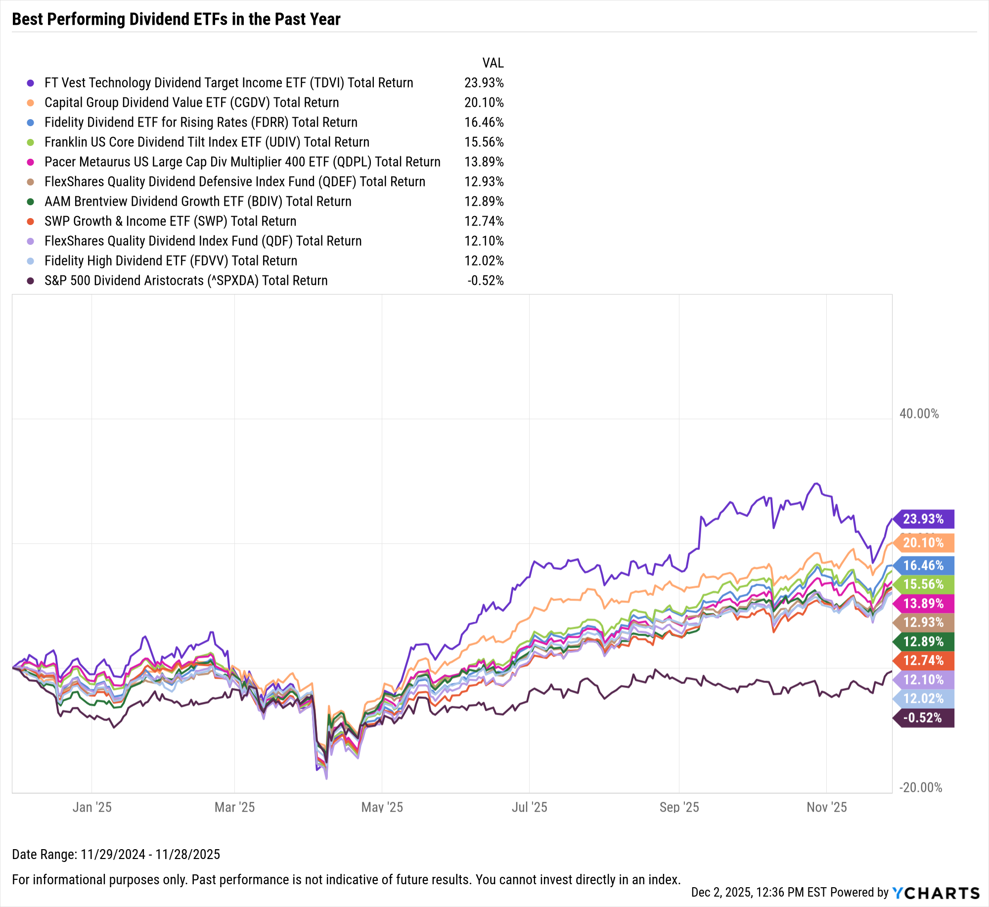 These are the top-performing dividend ETFs over the past year, as of November 30, 2025.