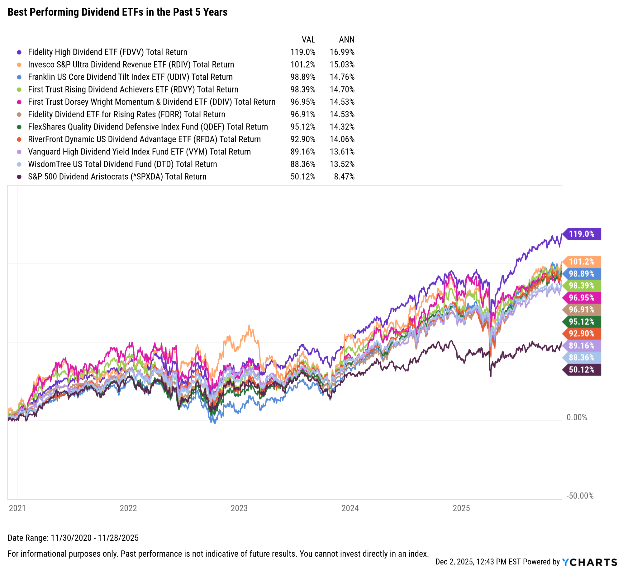 These are the top-performing dividend ETFs on an annualized basis between December 1, 2020 and November 30, 2025.