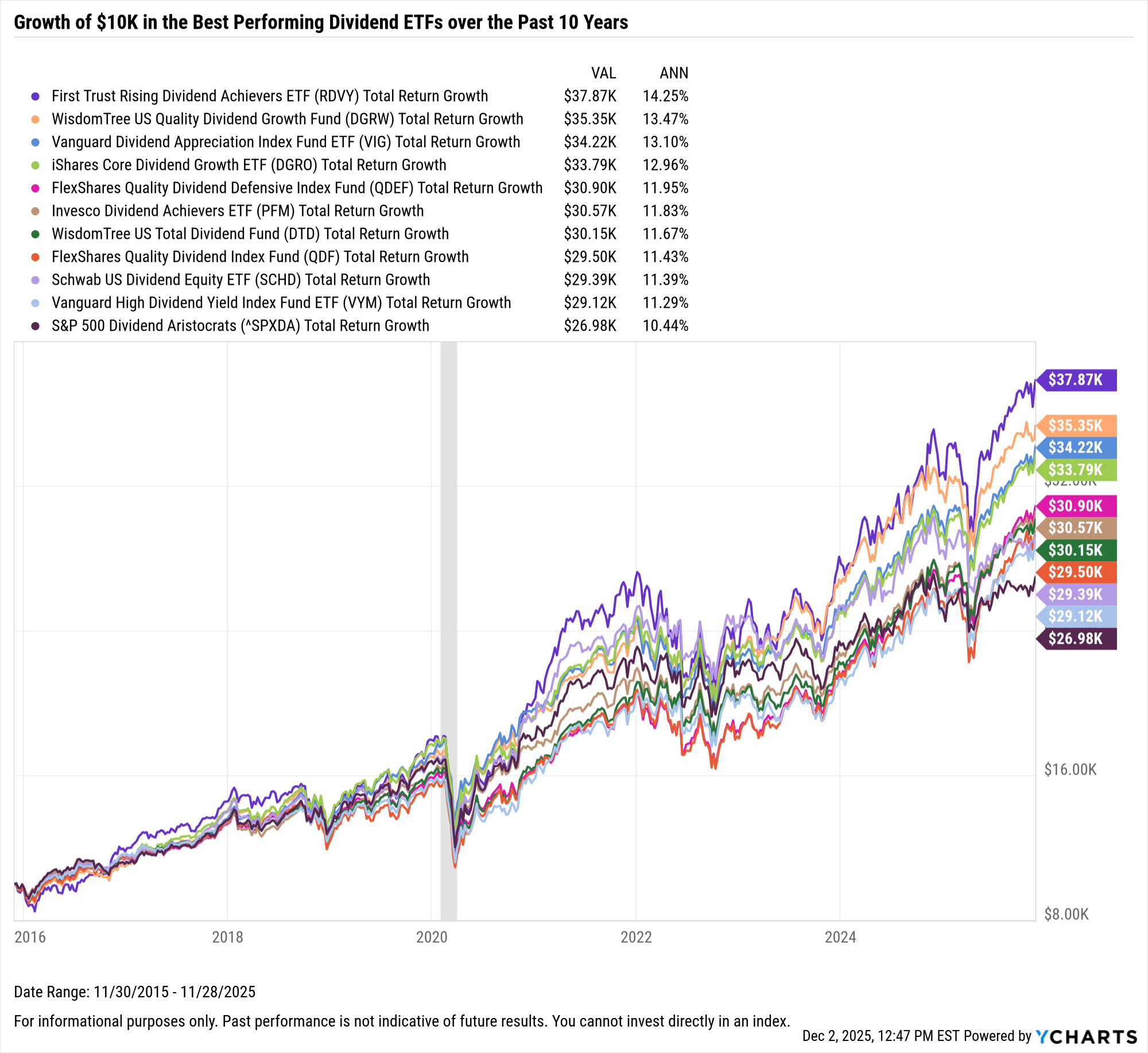 These are the top-performing dividend ETFs on an annualized basis between December 1, 2015 and November 30, 2025.