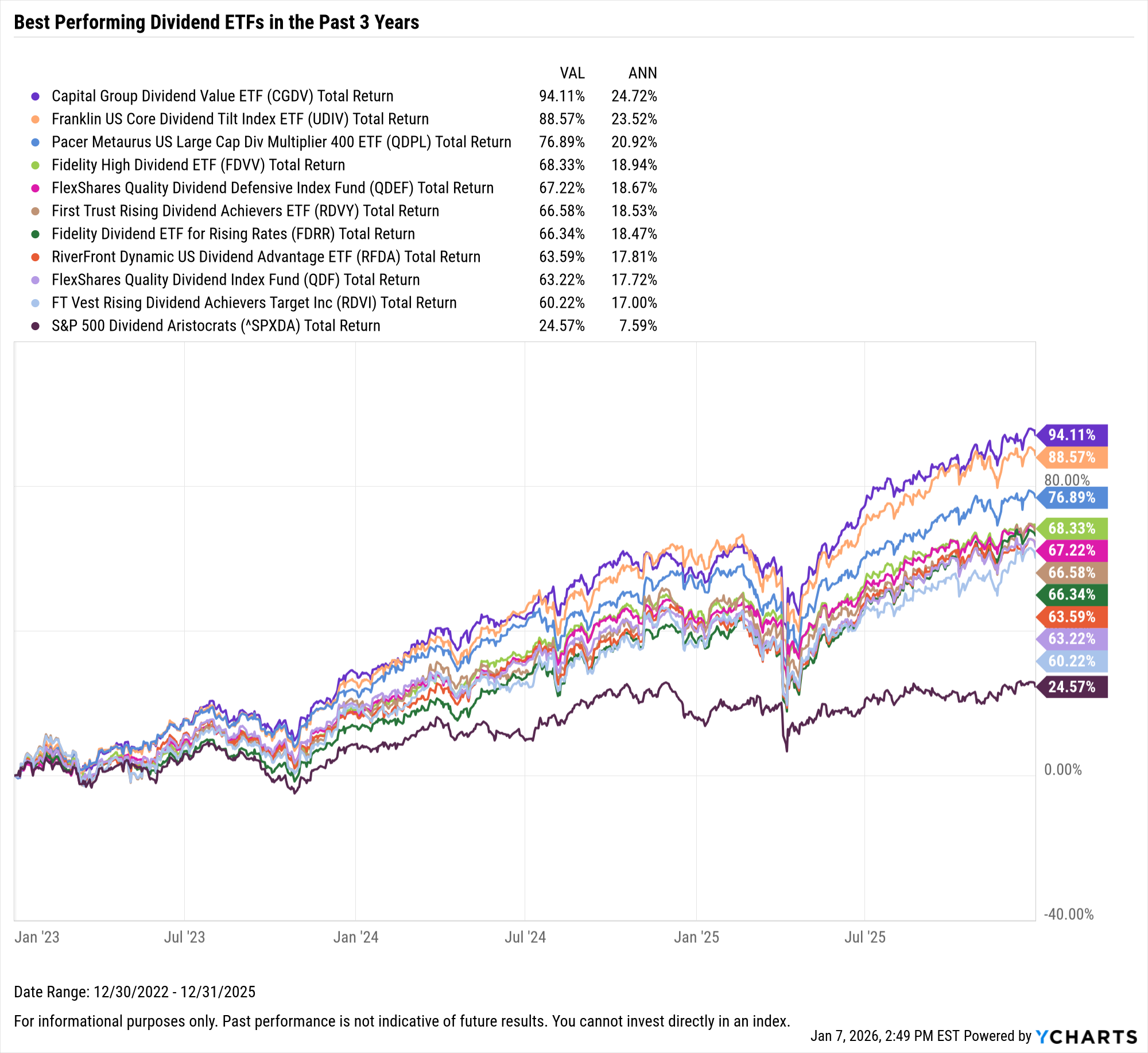 These are the top-performing dividend ETFs on an annualized basis between January 1st, 2021 and December 31, 2025.