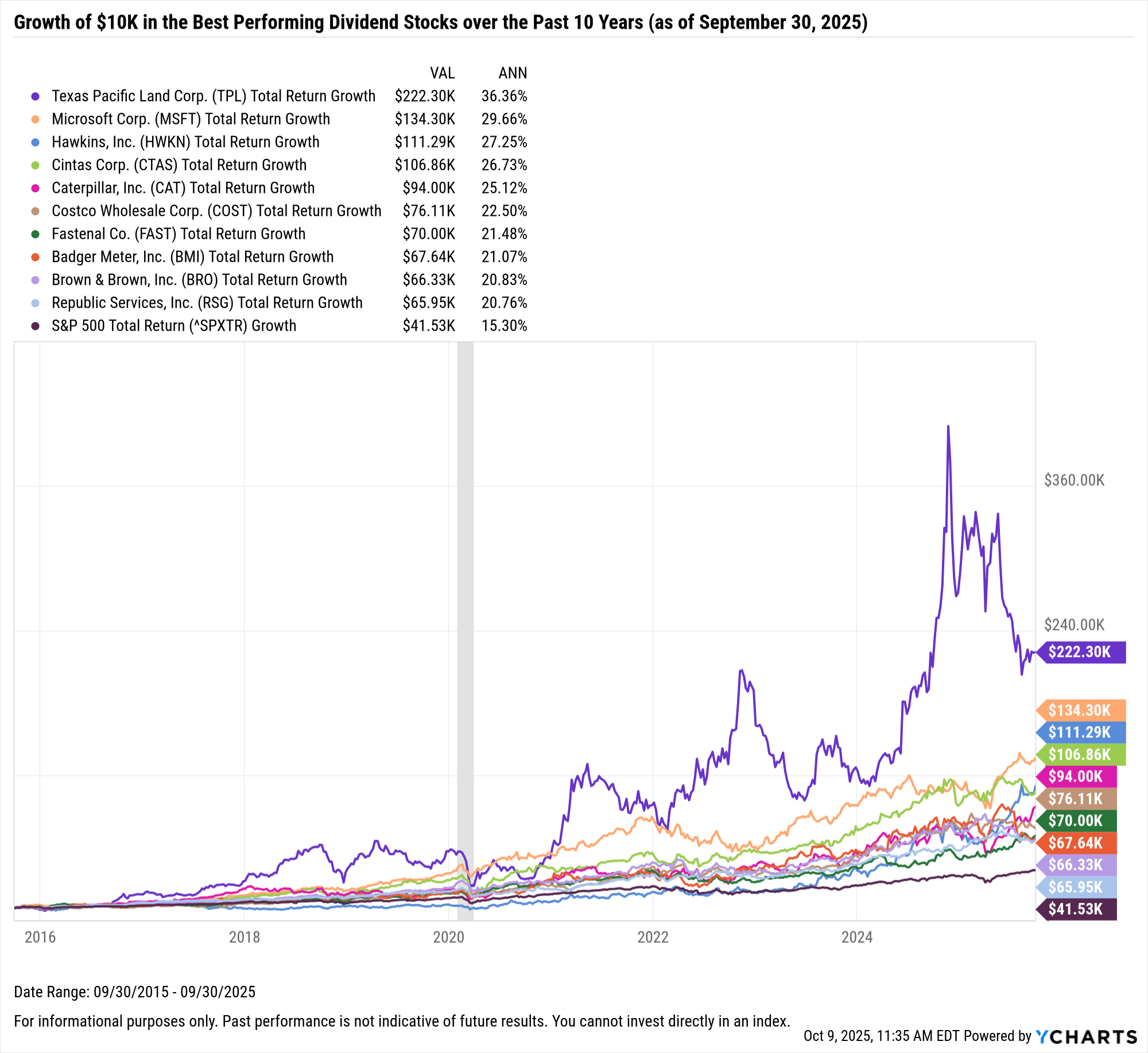 These are the top-performing dividend stocks on an annualized basis between October 1, 2015 and September 30, 2025.