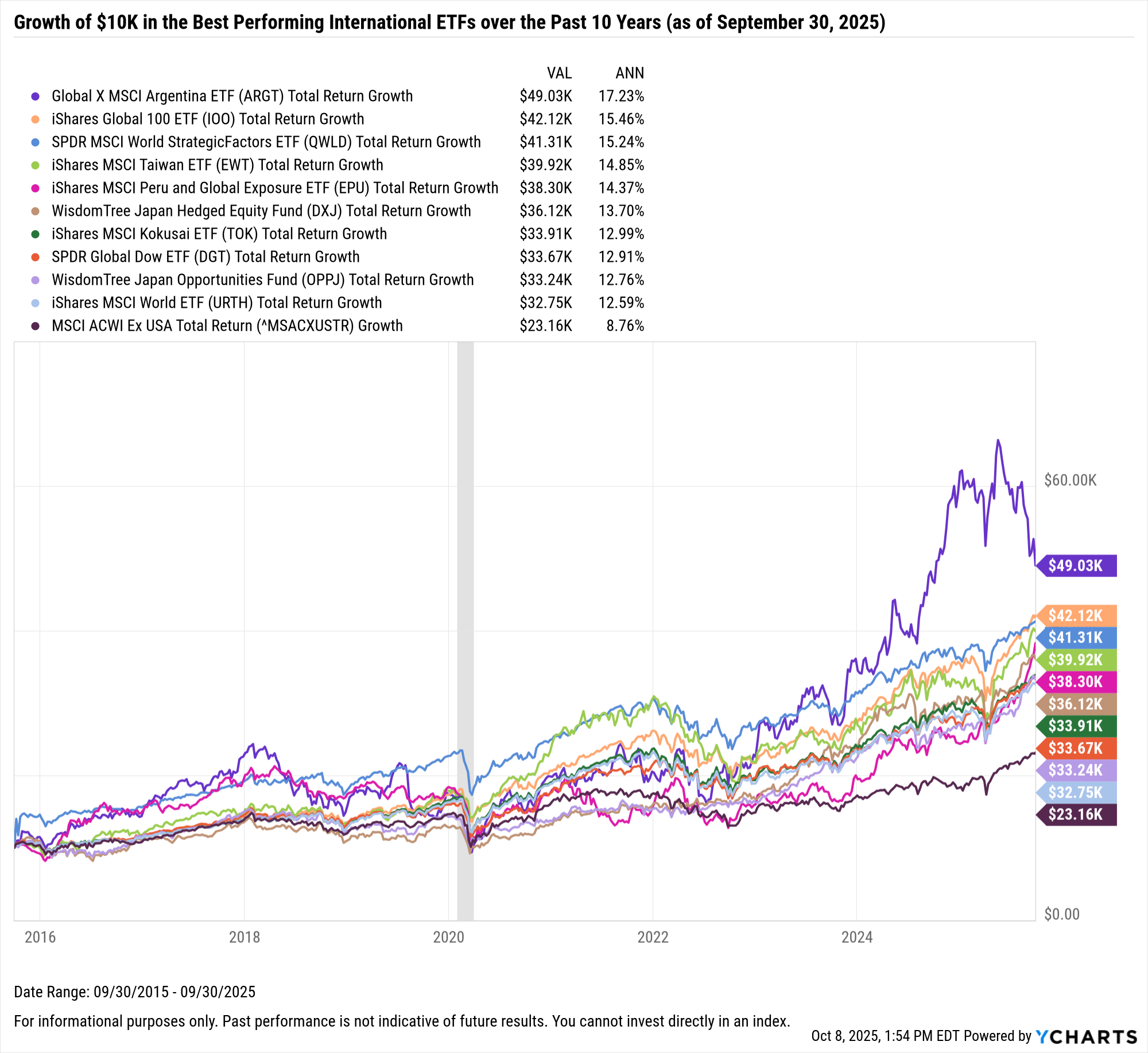 The best-performing international ETF in the last 10 years was the Global X MSCI Argentina ETF (ARGT). A $10,000 investment into this Argentina-focused ETF 10 years ago would be worth $49K today on a total return basis.