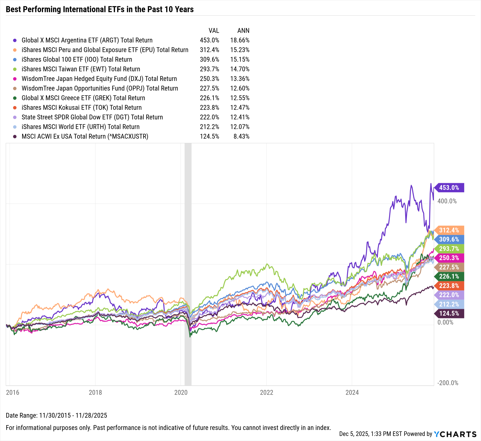 The best-performing international ETF in the last 10 years was the Global X MSCI Argentina ETF (ARGT). A $10,000 investment into this Argentina-focused ETF 10 years ago would be worth $55,300 today on a total return basis.