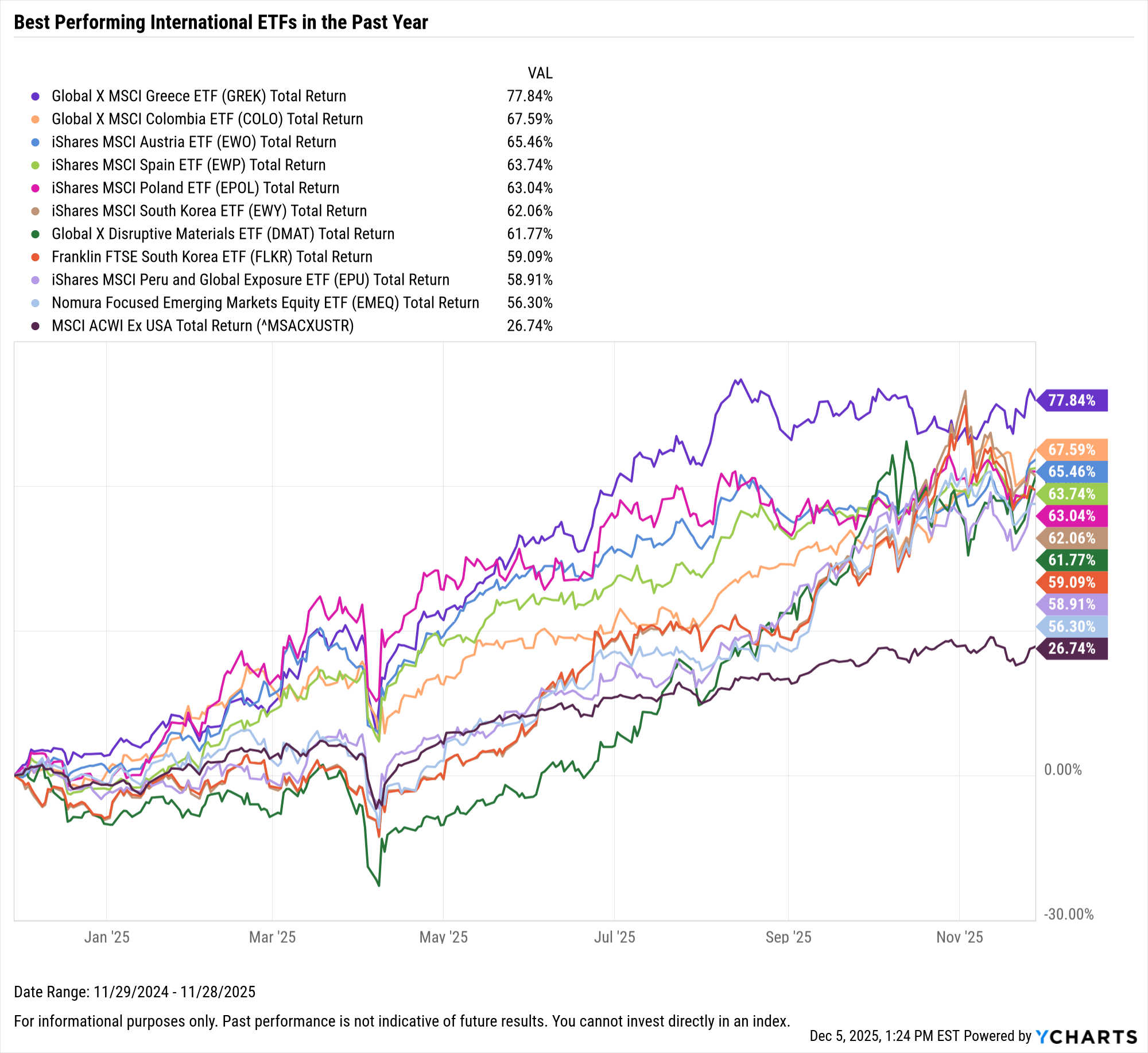 These are the top-performing international ETFs over the past year, as of November 30, 2025.