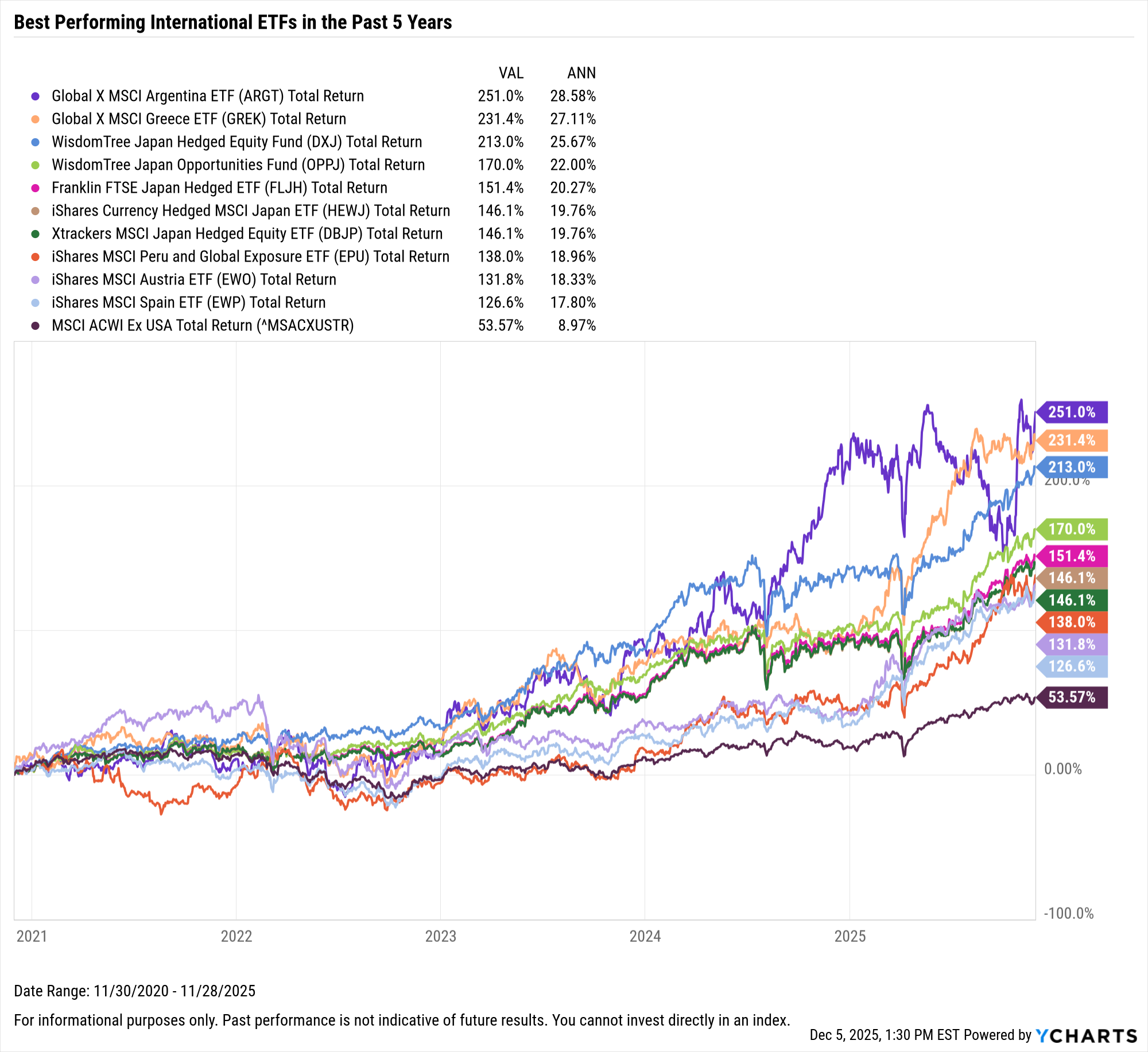 These are the top-performing international ETFs on an annualized basis between December 1, 2020 and November 30, 2025.