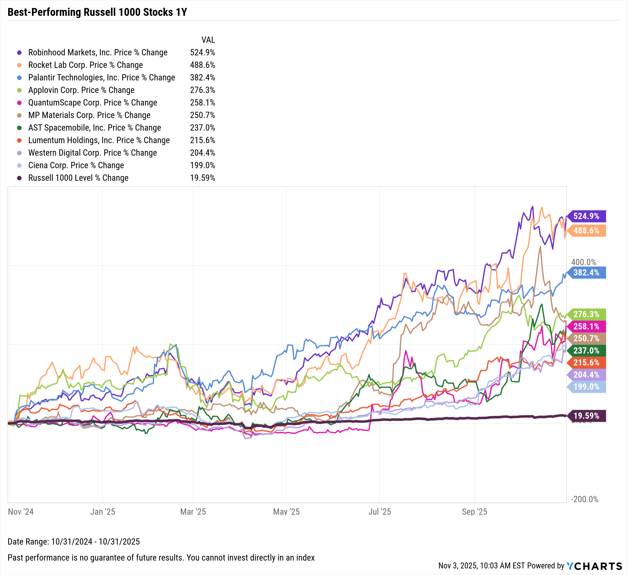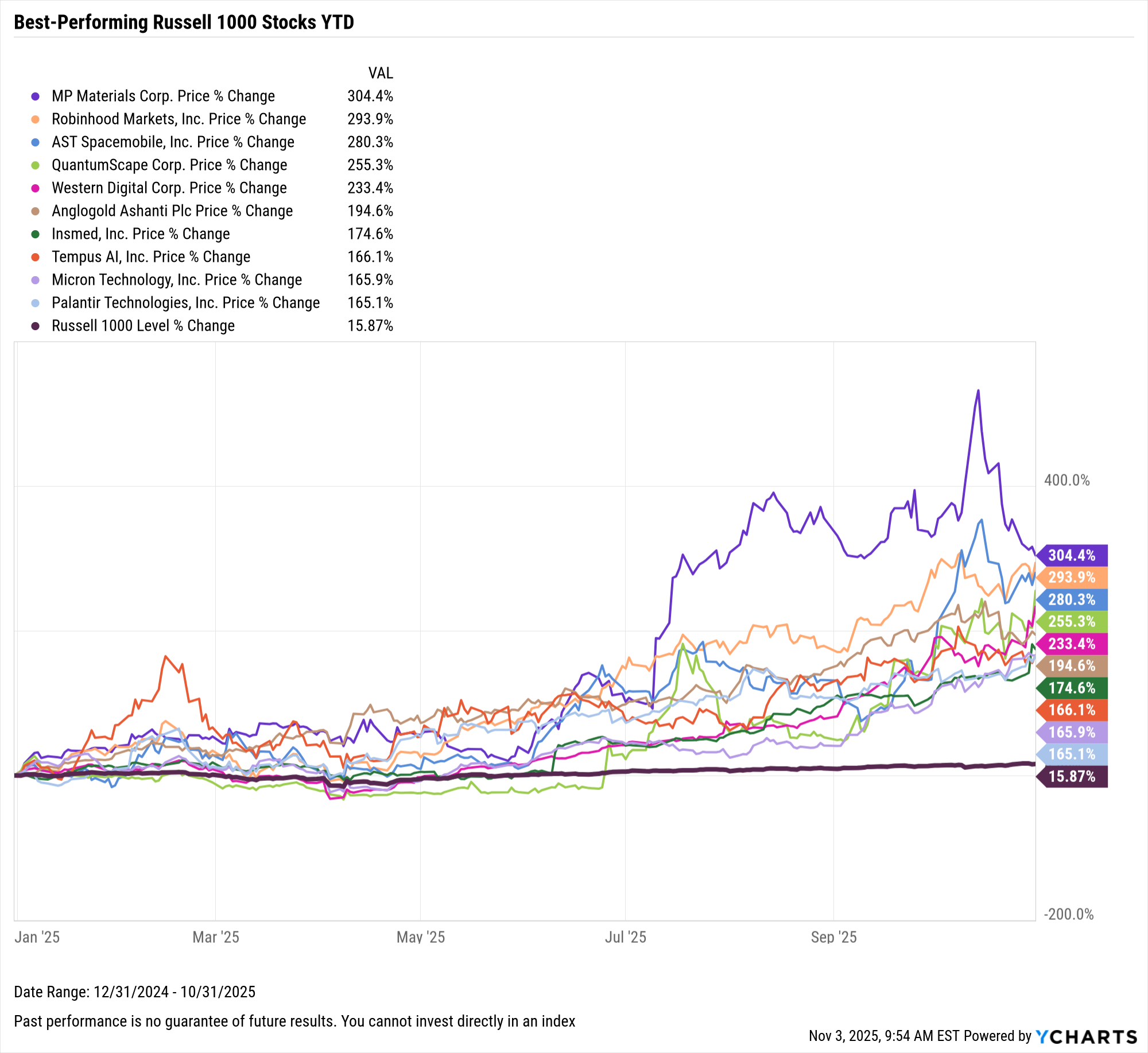 These are the top-performing stocks year-to-date in 2025, as of October 31, 2025. The best performing stocks of 2025 so far reflect investor conviction in critical materials, AI infrastructure, and precious metals. MP Materials Corp. (MP) dominates the Russell 1000 with an extraordinary 356.03% return year-to-date, followed by Robinhood Markets (HOOD) at 179.20%, Anglogold Ashanti (AU) at 166.15%, and Celsius Holdings (CELH) at 138.72%. The Russell 1000 overall rose just 5.42% in the same period.