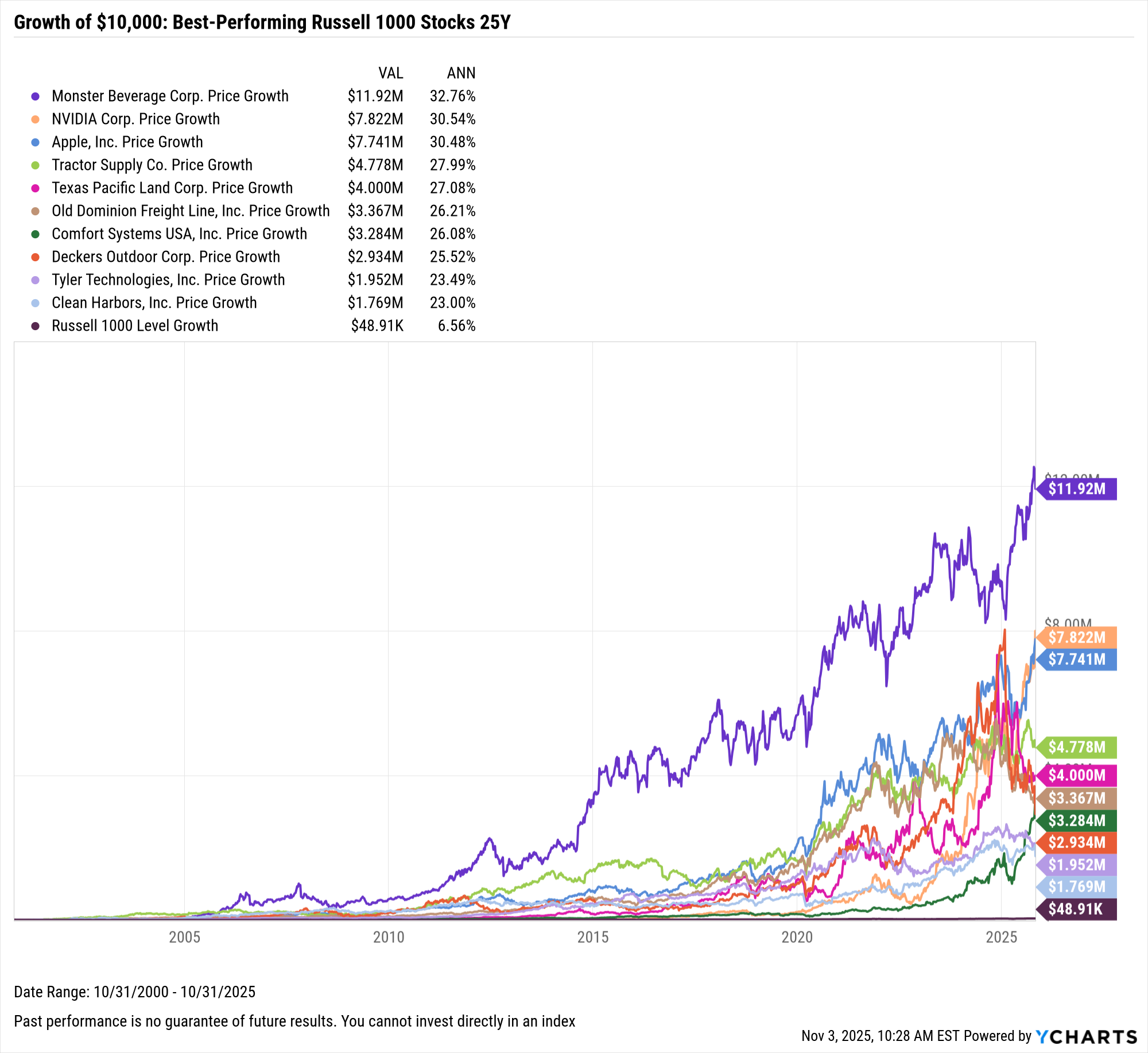 From 2025’s year-to-date leaders to the stunning 25-year returns of household names like Monster Beverage and NVIDIA, here’s what advisors need to know about the stocks that delivered year after year.