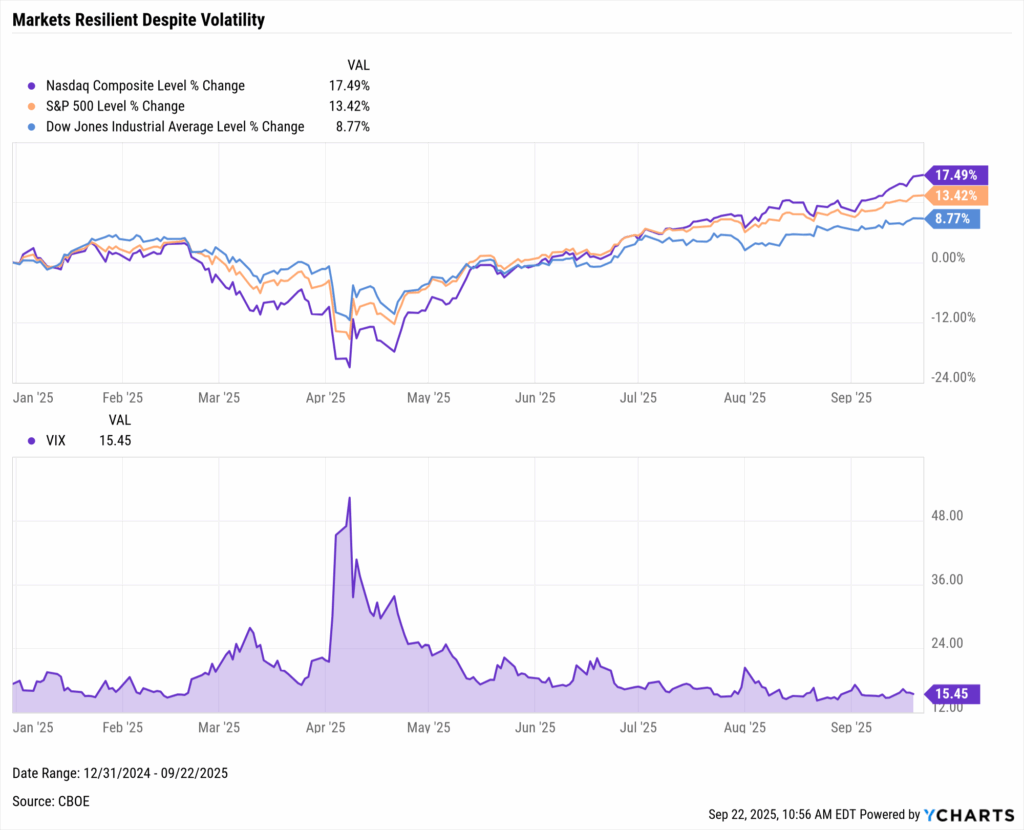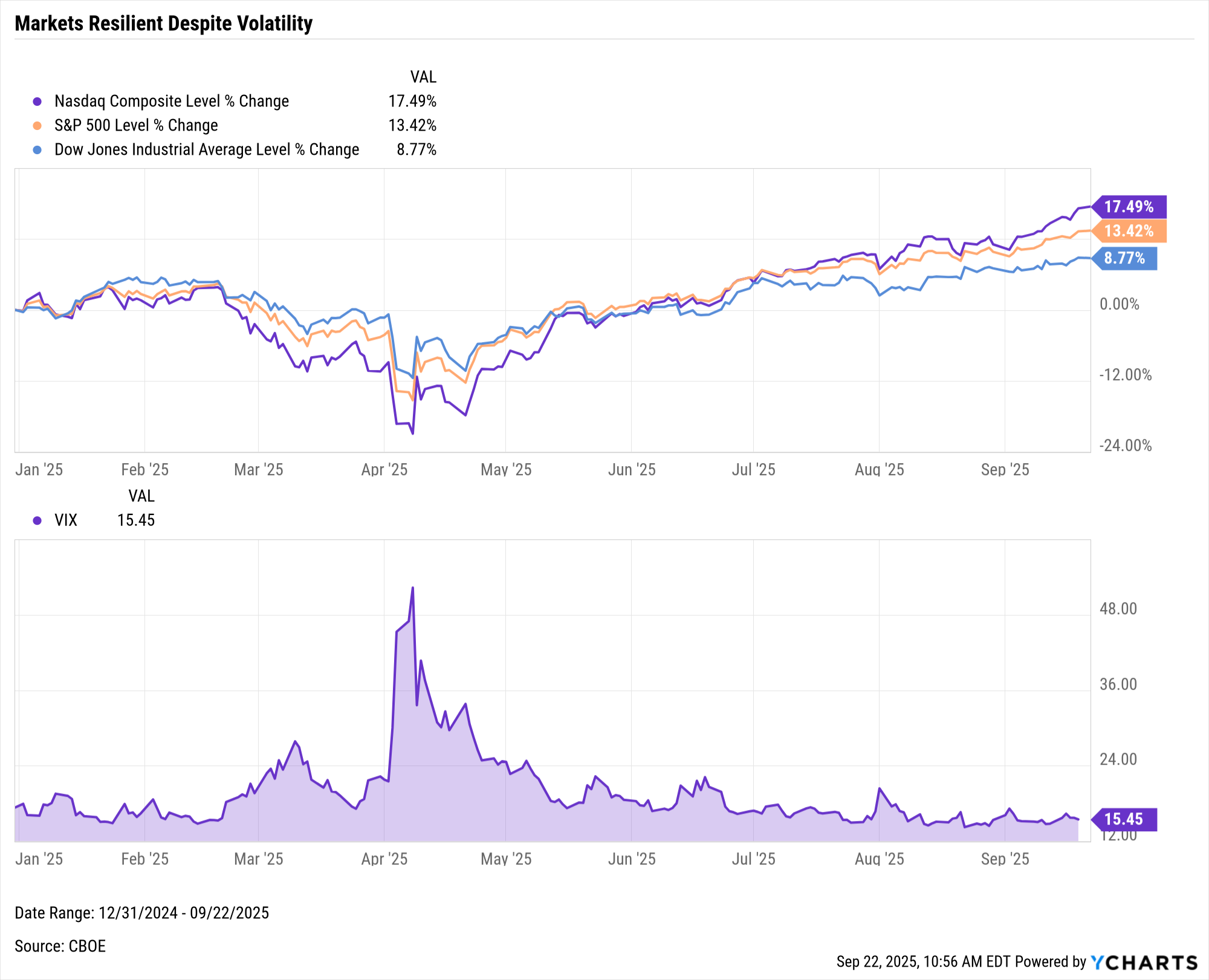 Through the first three quarters of 2025, U.S. equities have delivered another year of strong performance. As of late September, the Nasdaq is up nearly 17.5%, the S&P 500 has gained 13.4%, and the Dow has advanced 8.8%.