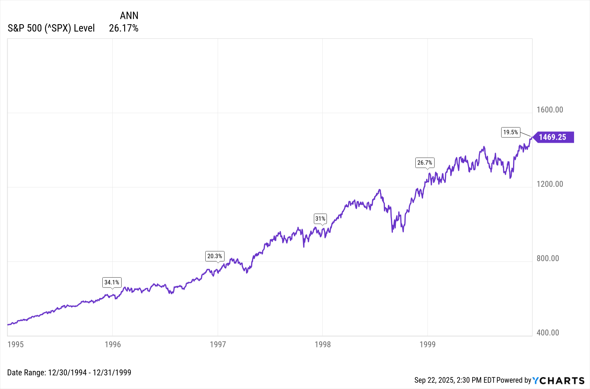 Line chart of the S&P 500 index from 1995 to 1999 showing a steady rise with annual returns labeled above trend points.